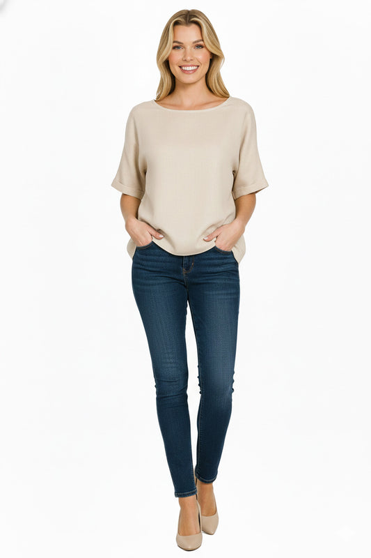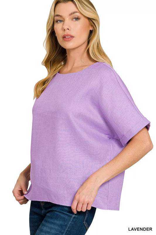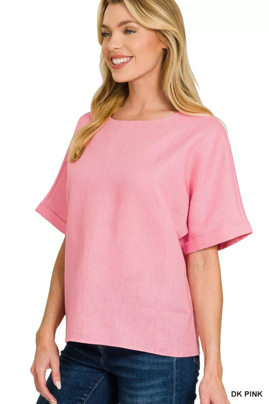 Zenana Linen Round Neck Cuffed Sleeve Top