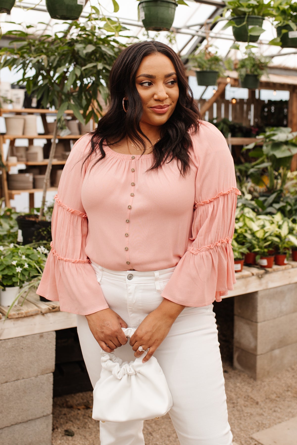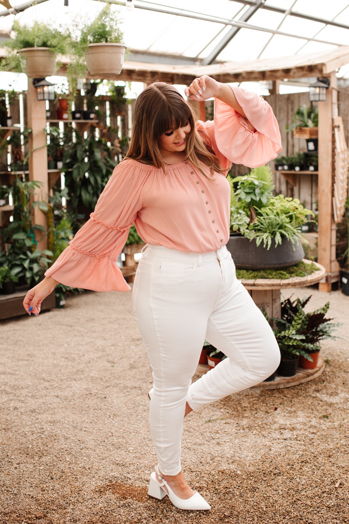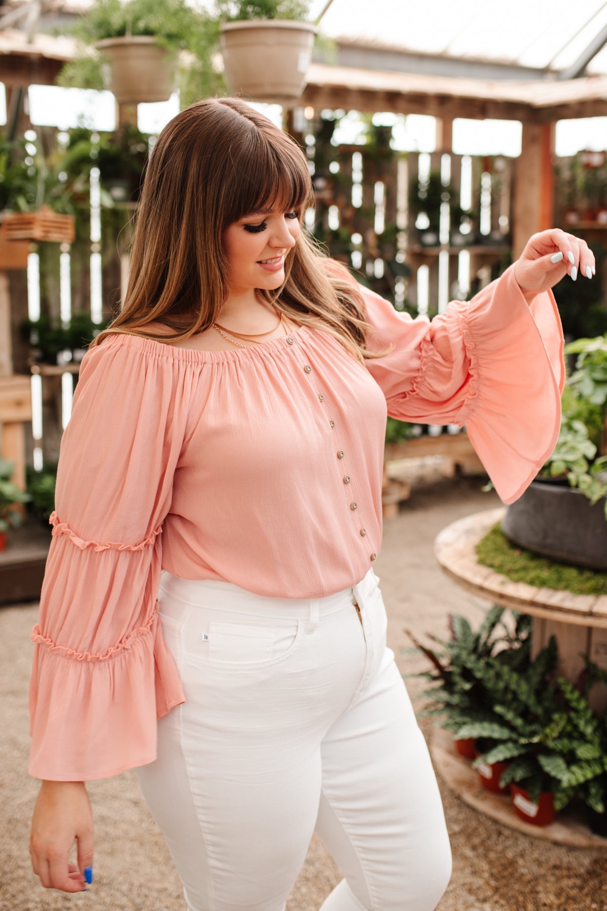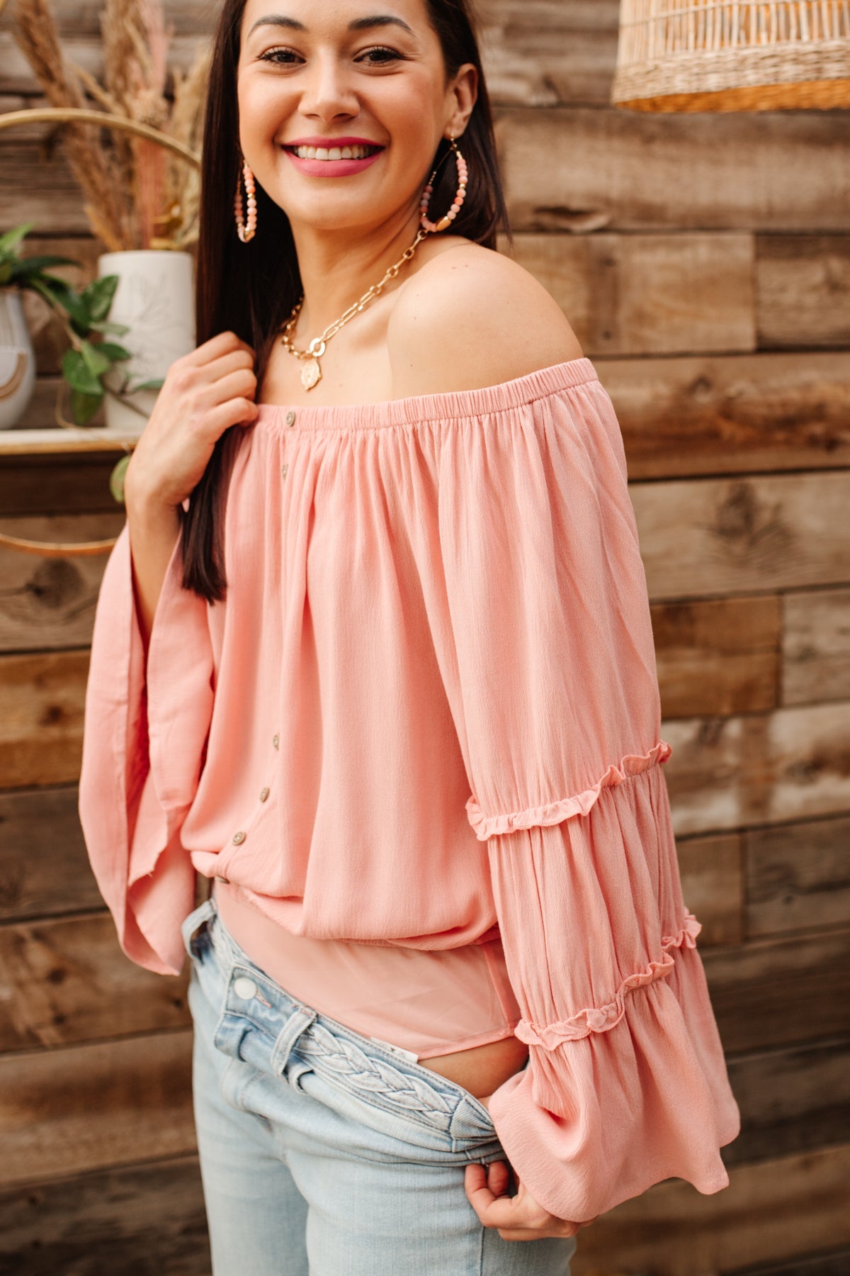 The Sunset Sailing Bodysuit has a dreaming of summer nights spent on a yacht! This stunning top is composed of an off shoulder silhouette, a button placket down center front, and bell sleeves with a dainty ruffle detail, all shaped from a lightweight gauzy fabric.