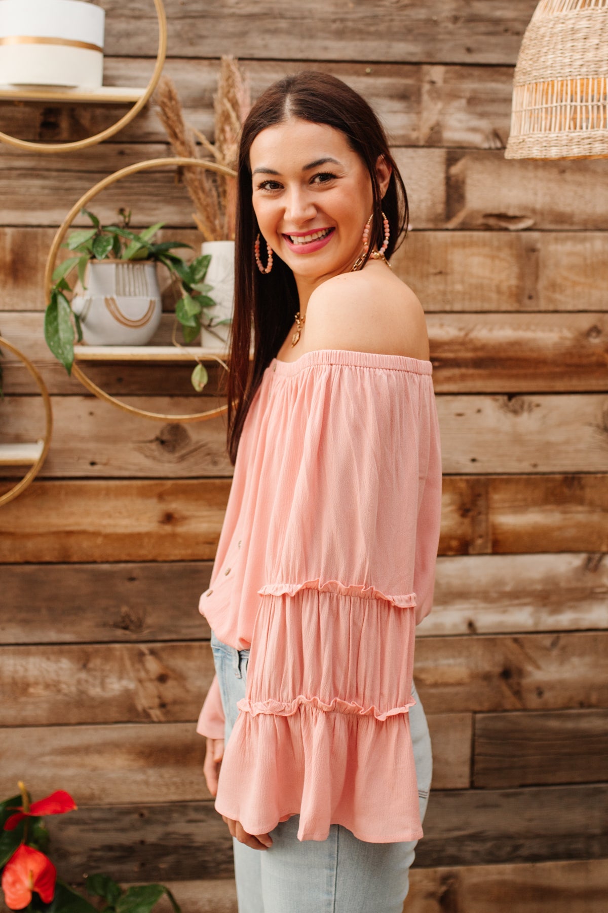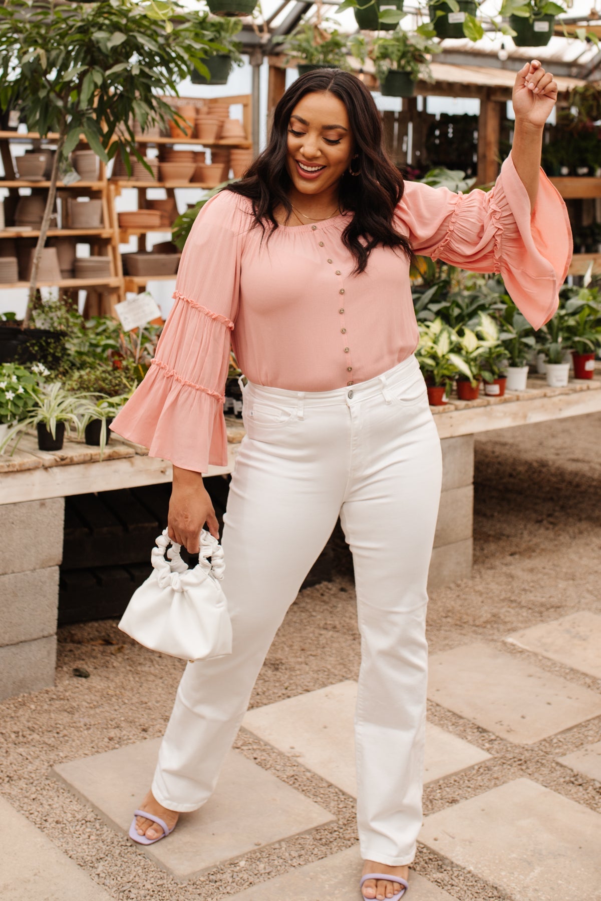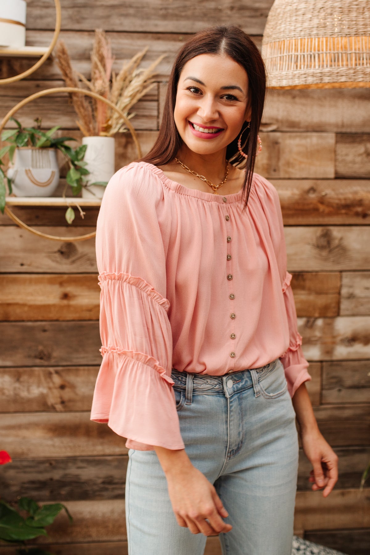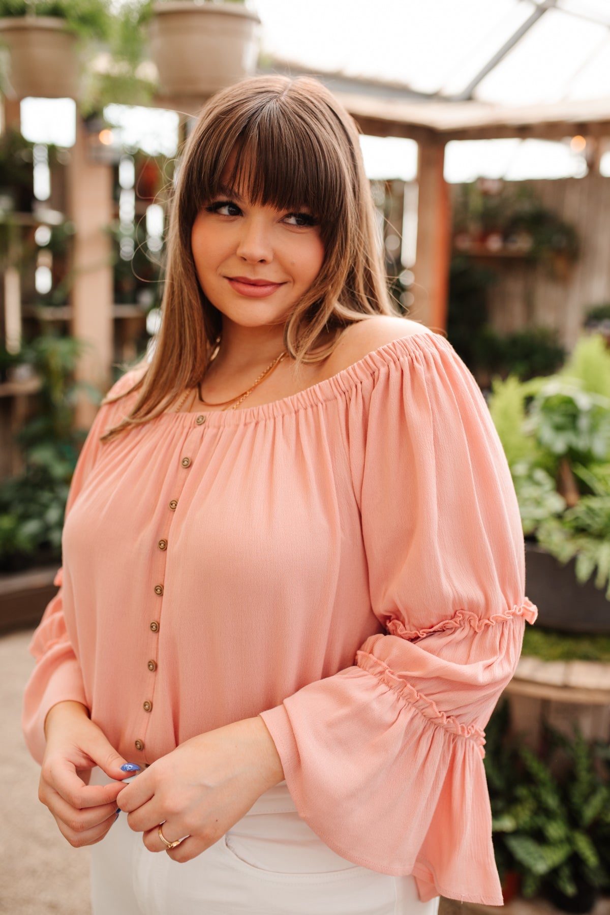 The Sunset Sailing Bodysuit has a dreaming of summer nights spent on a yacht! This stunning top is composed of an off shoulder silhouette, a button placket down center front, and bell sleeves with a dainty ruffle detail, all shaped from a lightweight gauzy fabric.